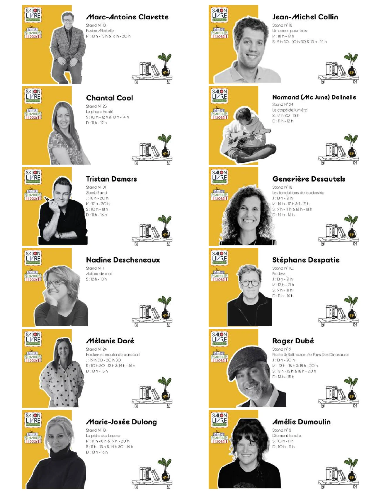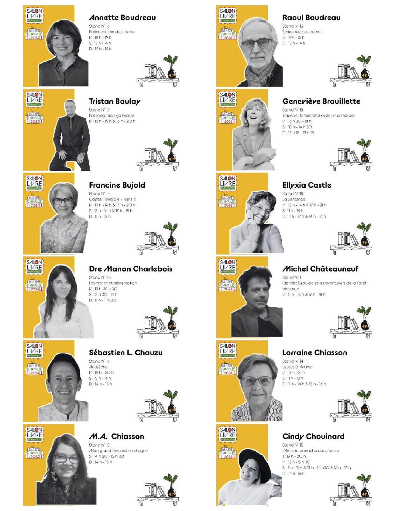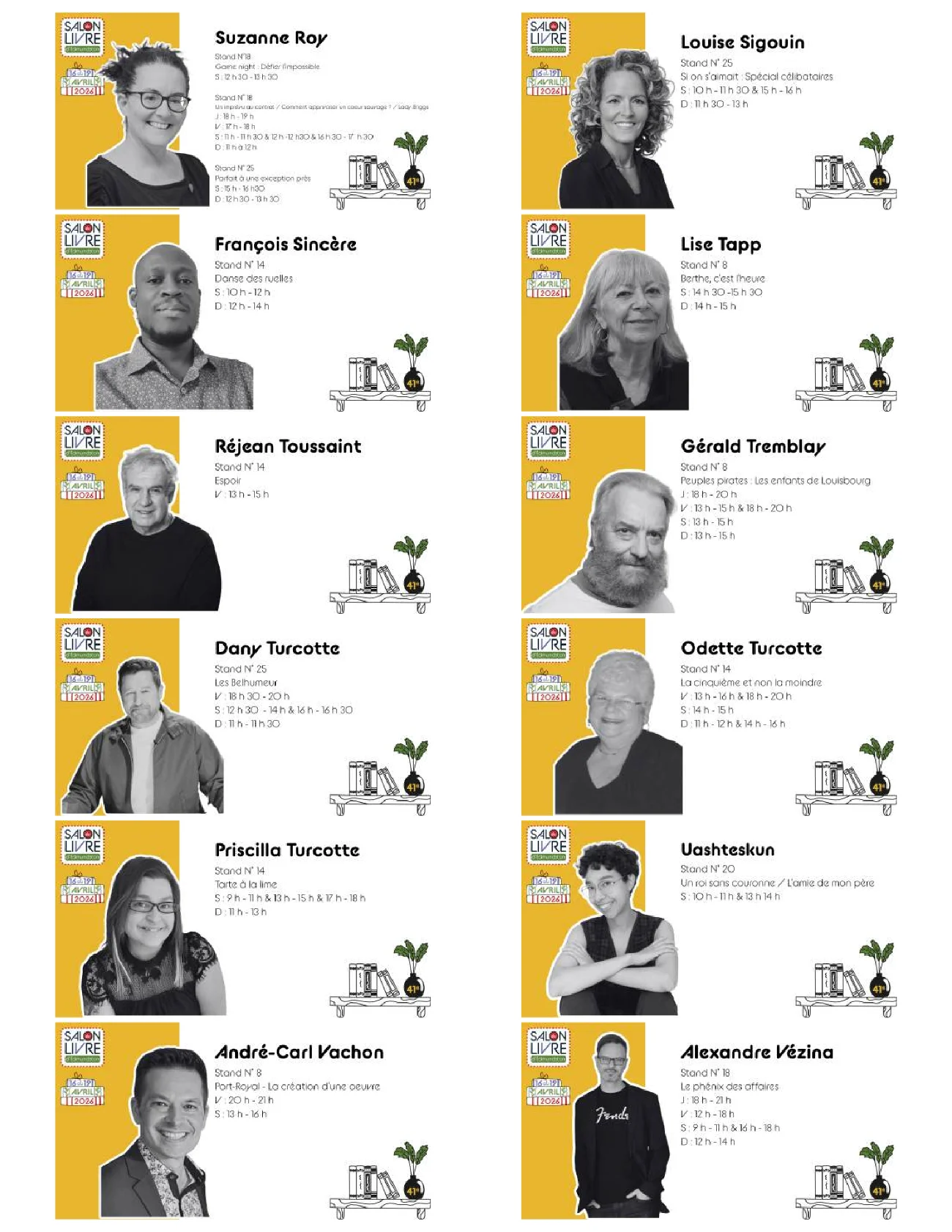 Accueil Programmation Lancements Causeries Conférences Activités littéraires Animations jeunesse Hors-salon Tables rondes Auteurs Prix littéraire Circuit littéraire Partenaires Informations Horaire et emplacement Coordonnées Comité organisateur Affiches précédentes Questions ou commentaires Auteurs