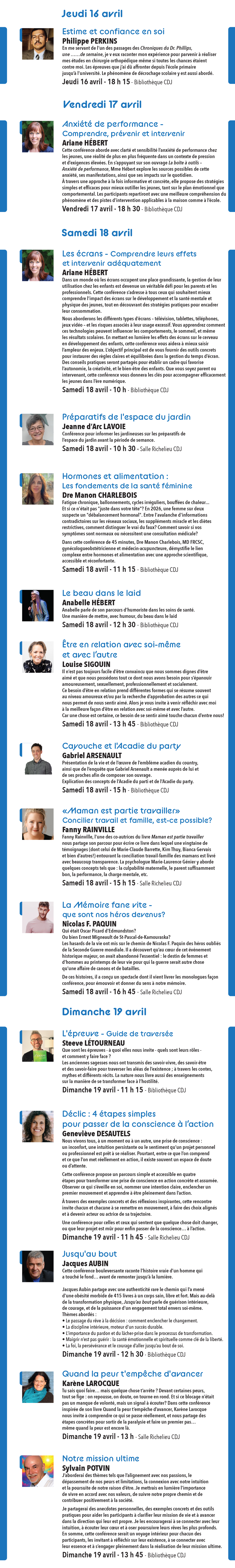 Accueil Programmation Lancements Causeries Conférences Activités littéraires Animations jeunesse Hors-salon Tables rondes Auteurs Prix littéraire Circuit littéraire Partenaires Informations Horaire et emplacement Coordonnées Comité organisateur Affiches précédentes Questions ou commentaires Programmation Conférences
